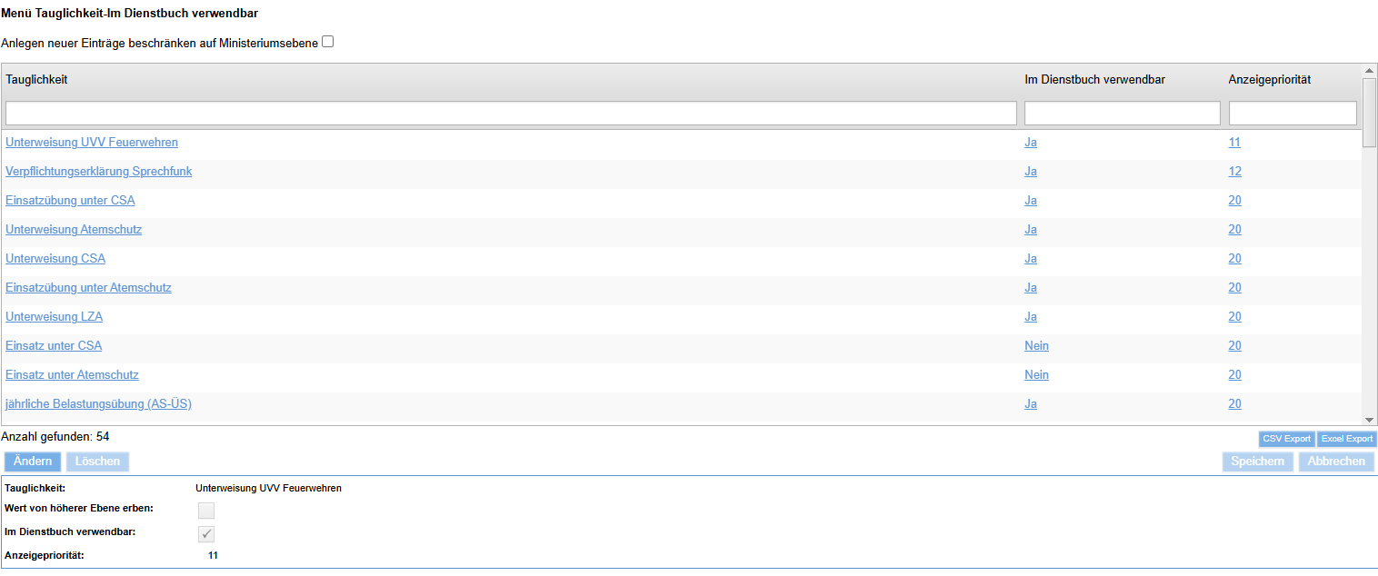 Im Menü-Editor -> Personen -> "Tauglichkeiten-Im Dienstbuch verwendbar" können auf der Ebene des Ministeriums, der Landkreise und der Gemeinden für die einzelnen Tauglichkeiten festgelegt werden, ob diese unter den Tauglichkeiten im Dienstbuch zugeordnet werden kann. Wenn der Haken "Im Dienstbuch verwenden" gesetzt ist, steht die Tauglichkeit dann im Dienstbuch zur Verfügung. Wenn der Haken "Wert von höherer Ebene erben" aktiv ist, wird die Voreinstellung von der übergeordneten Ebene übernommen.