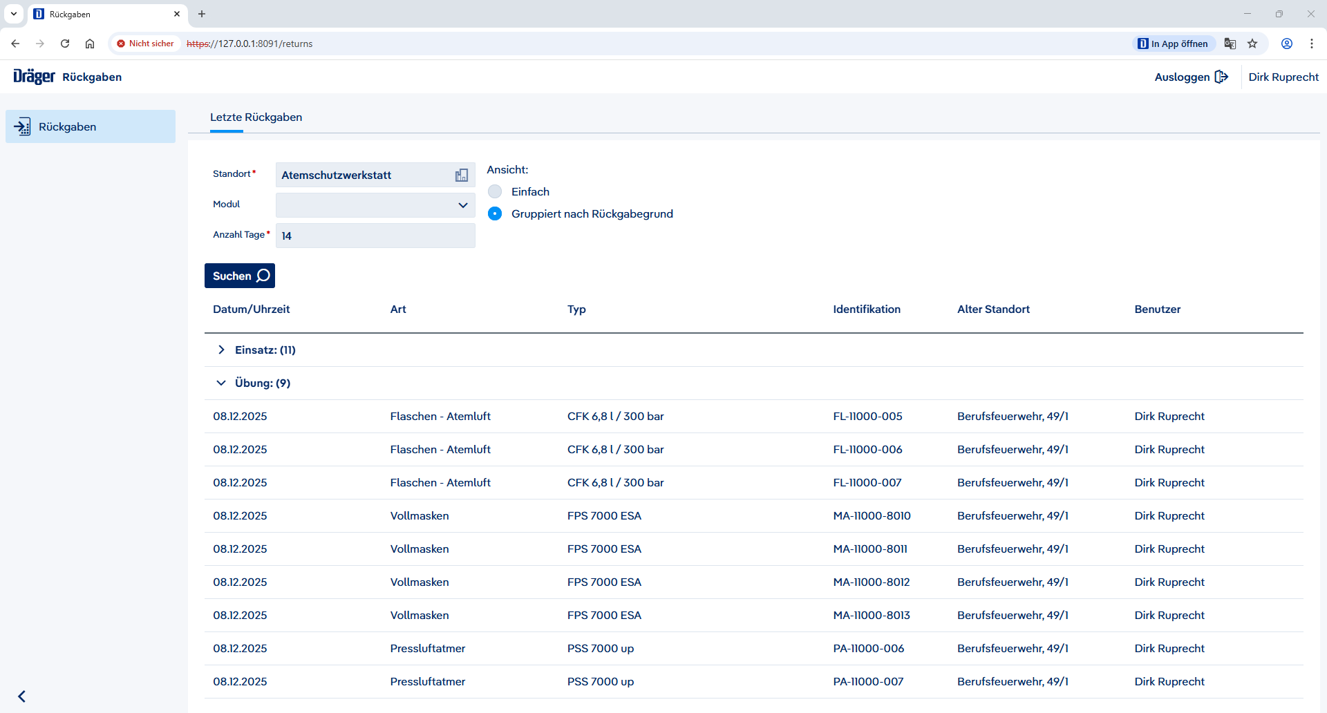 In der Ansicht Letzte Rückgaben werden alle Geräte angezeigt, die in einem gewissen Zeitraum auf einen bestimmten Standort zurügegeben worden sind. Hierbei kann nach einer einfachen Ansicht oder einer Ansicht gruppiert nach Rückgabegrund gewählt werden.
