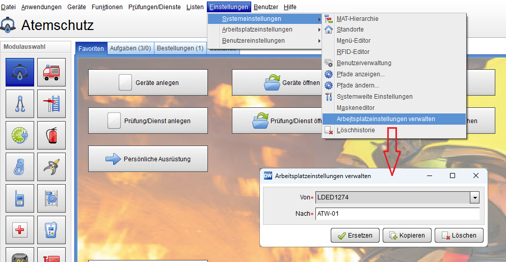 Über diese Funktion können zentralgespeicherte Arbeitsplatzeinstellungen auf einen anderen Arbeitsplatz übertragen oder gelöscht werden.