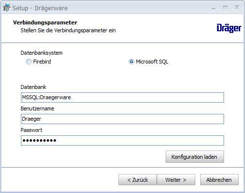 Anstelle des kostenfreien Datenbankmanagementsystems (DBMS) Firebird kann die Drägerware auch unter dem DBMS Microsoft® SQL (MS-SQL) betrieben werden. Dies setzt entweder die Version 9000 oder eine kostenpflichtige Lizenz der Drägerware für die Nutzung unter MS-SQL voraus.