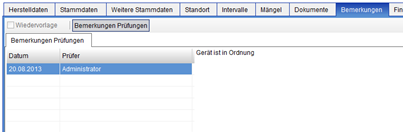 Über den Schalter Bemerkungen Prüfungen können alle Bemerkungen angezeigt werden, die zu dem Gerät bei den Prüfungen erfasst wurden. Es wird das Datum der Prüfung sowie der Prüfer angezeigt.