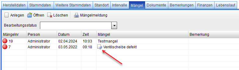 Alle Mängel eines Gerätes werden auf dieser Registerkarte angezeigt.